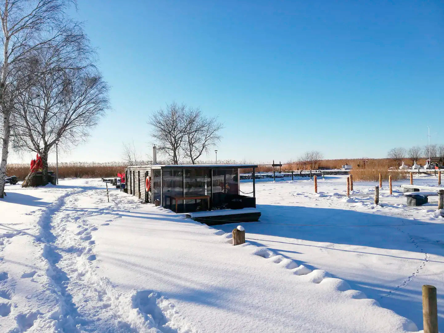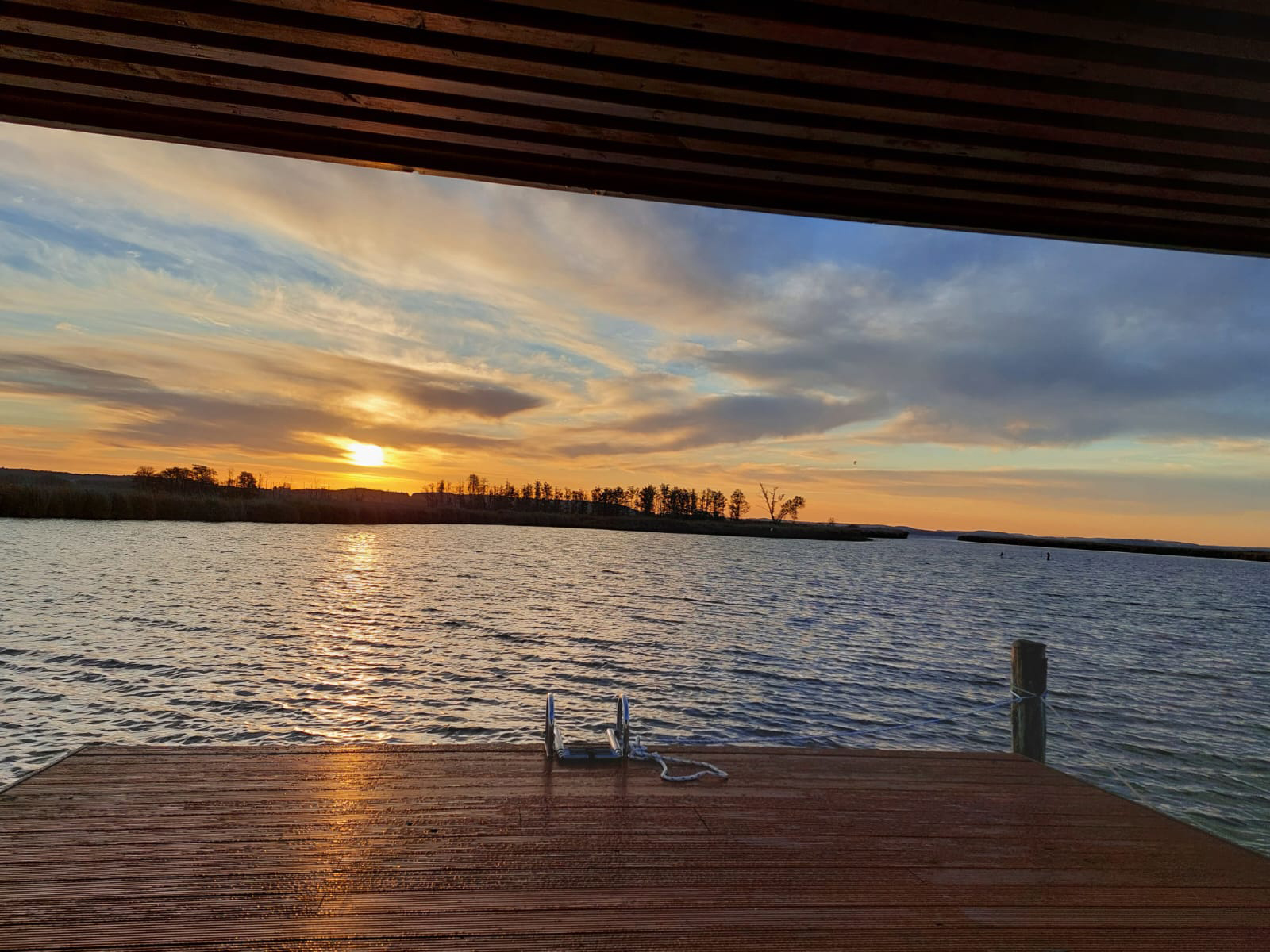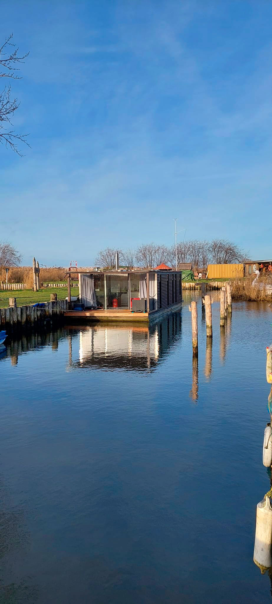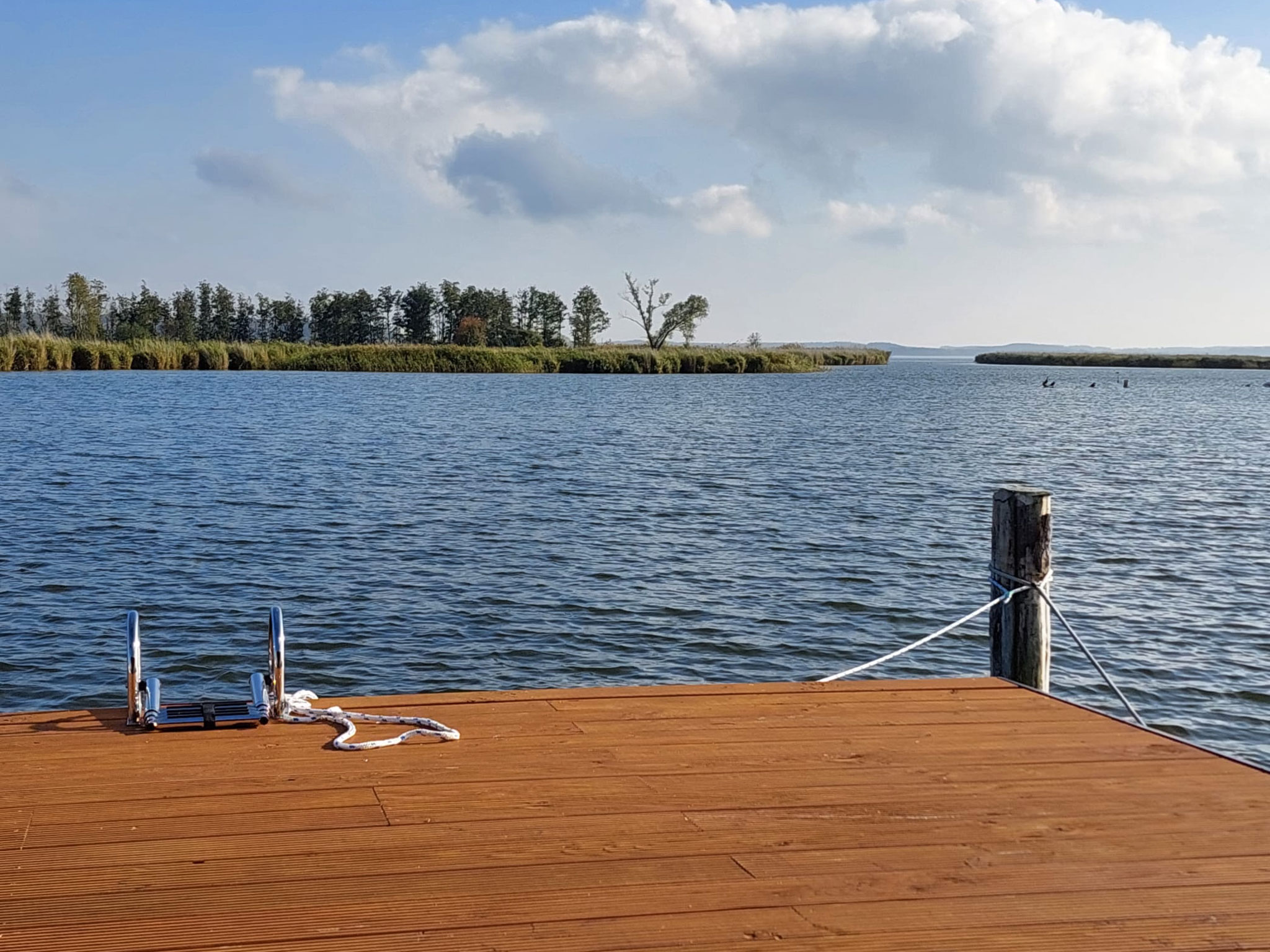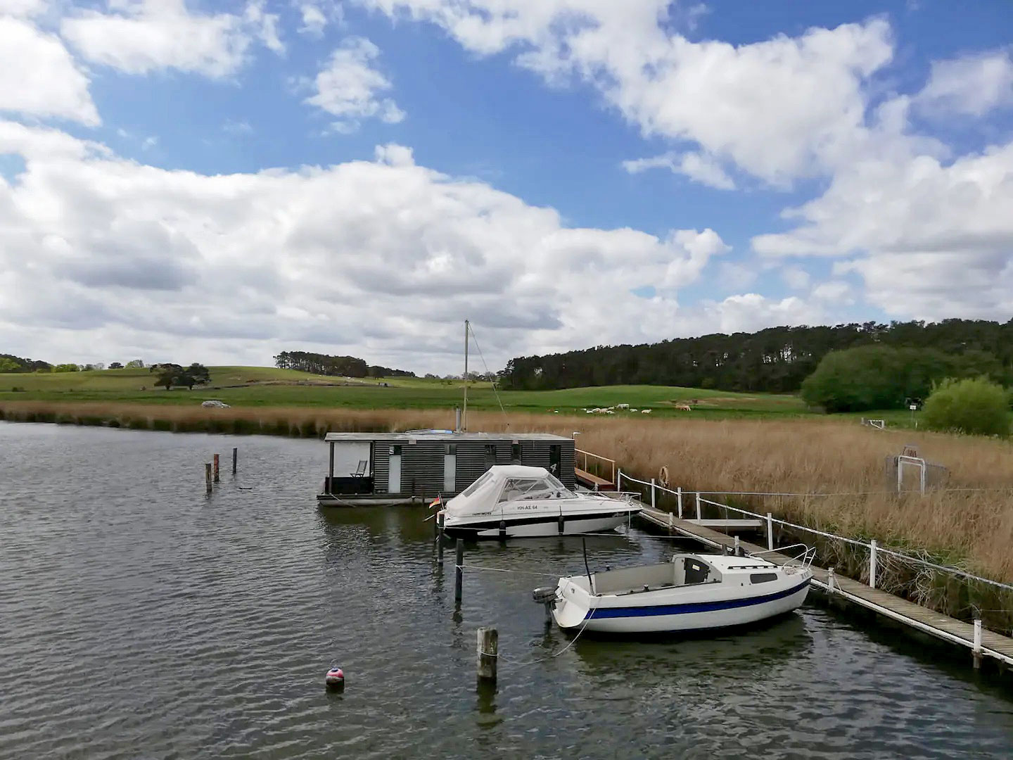 Im Sommerhalbjahr liegt das AquariHus in der Melle, einem malerischen Arm des Achterwassers, im Winterhalbjahr im Hafen Loddin.