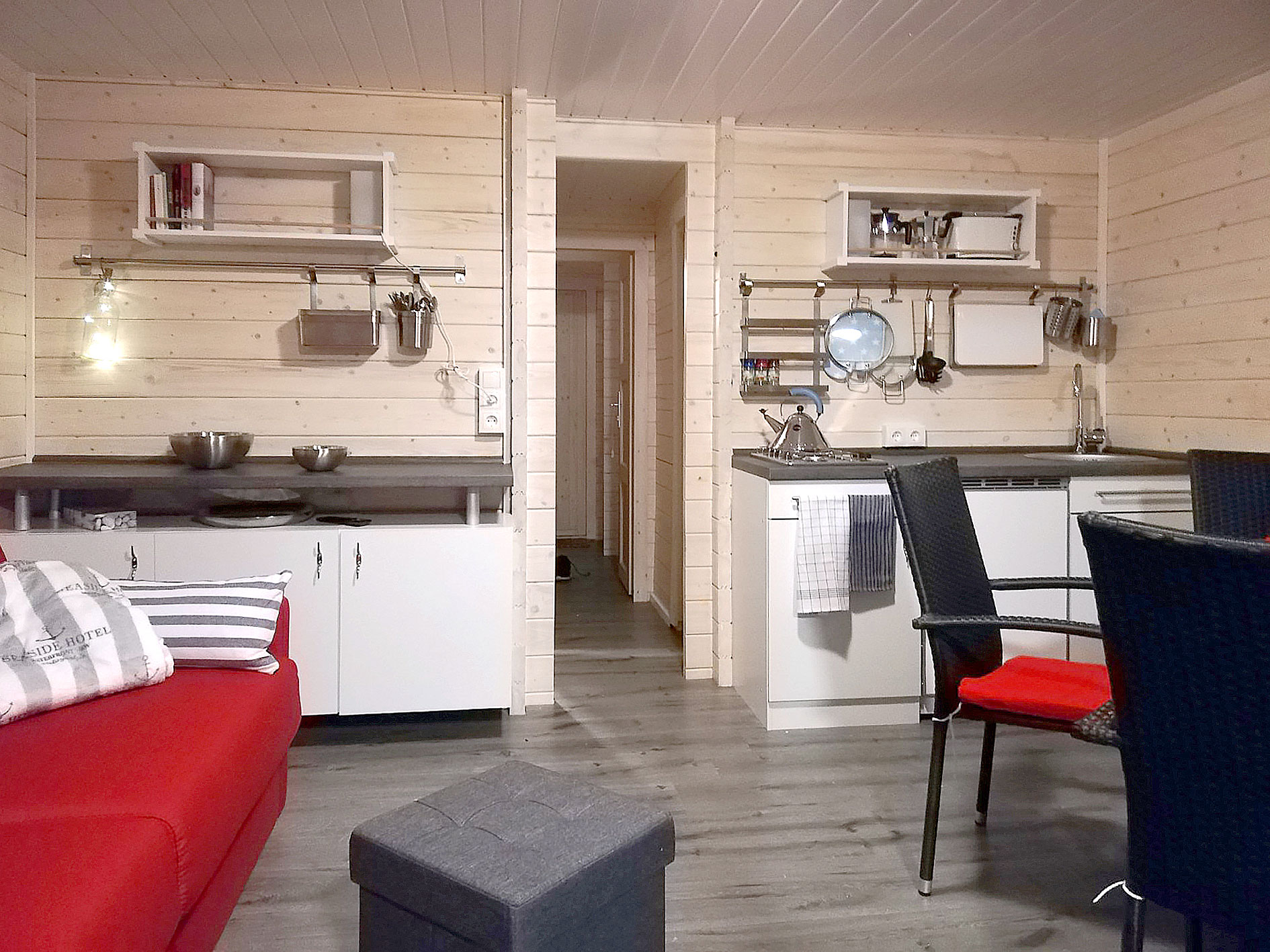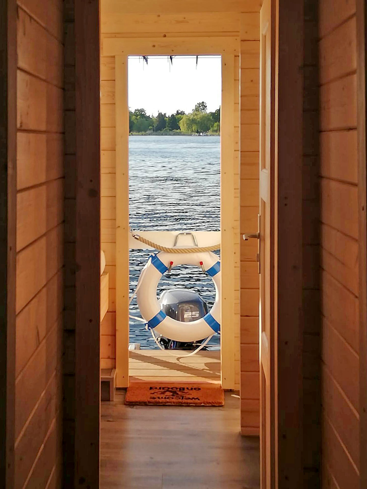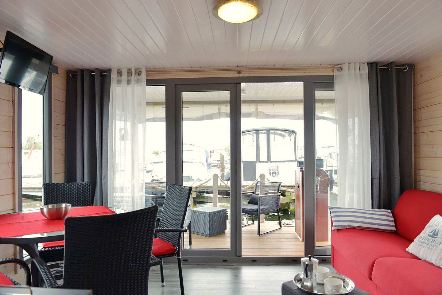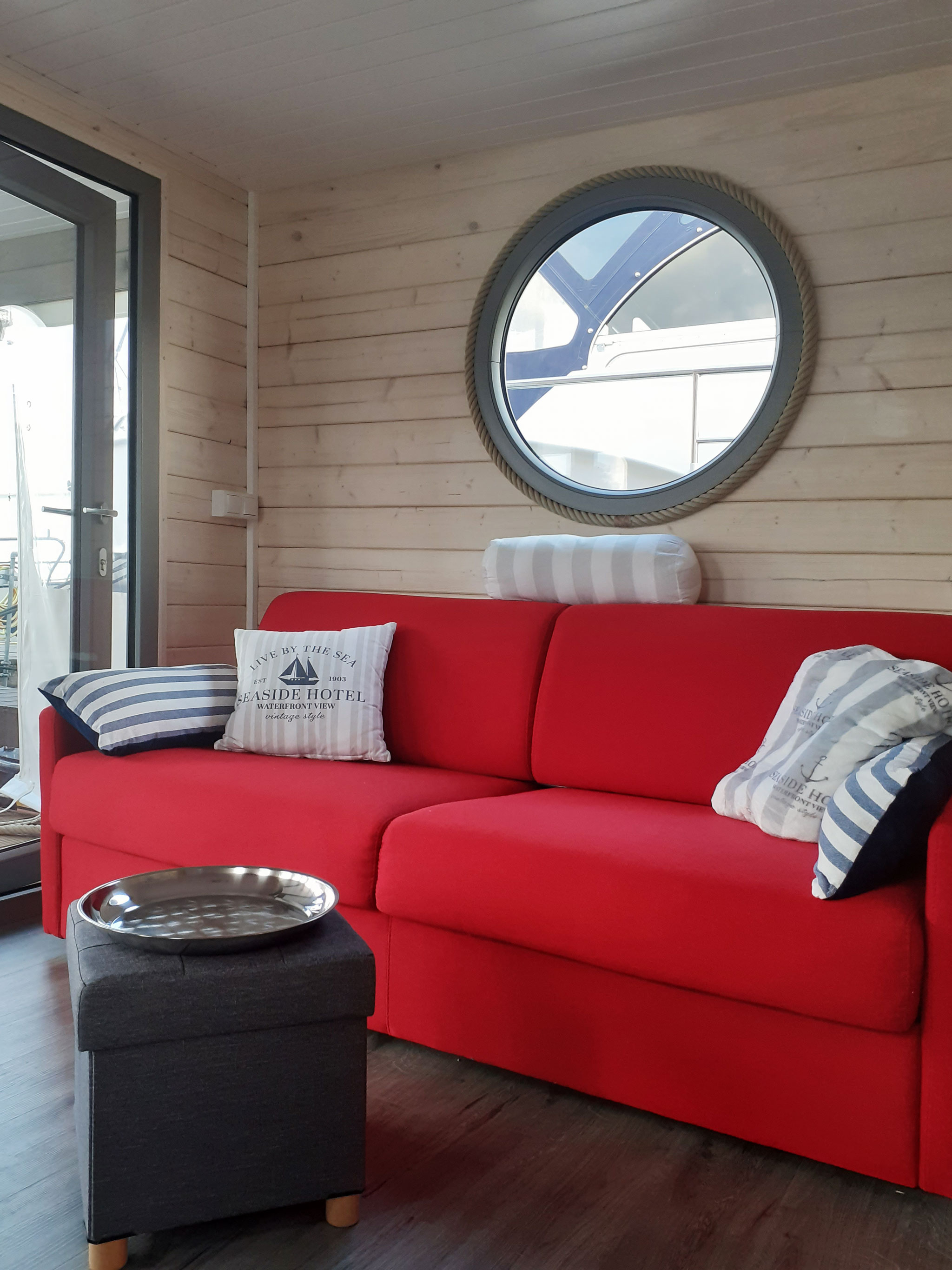 Das NautikHus ist ausgestattet mit zwei Kojen, WC und Dusche, sowie einem Salon mit Pantry-Zeile als Kombüse. Eine zehn Quadratmeter große überdachte Terrasse am Bug mit Lounge-Set lädt zum Verweilen ein.