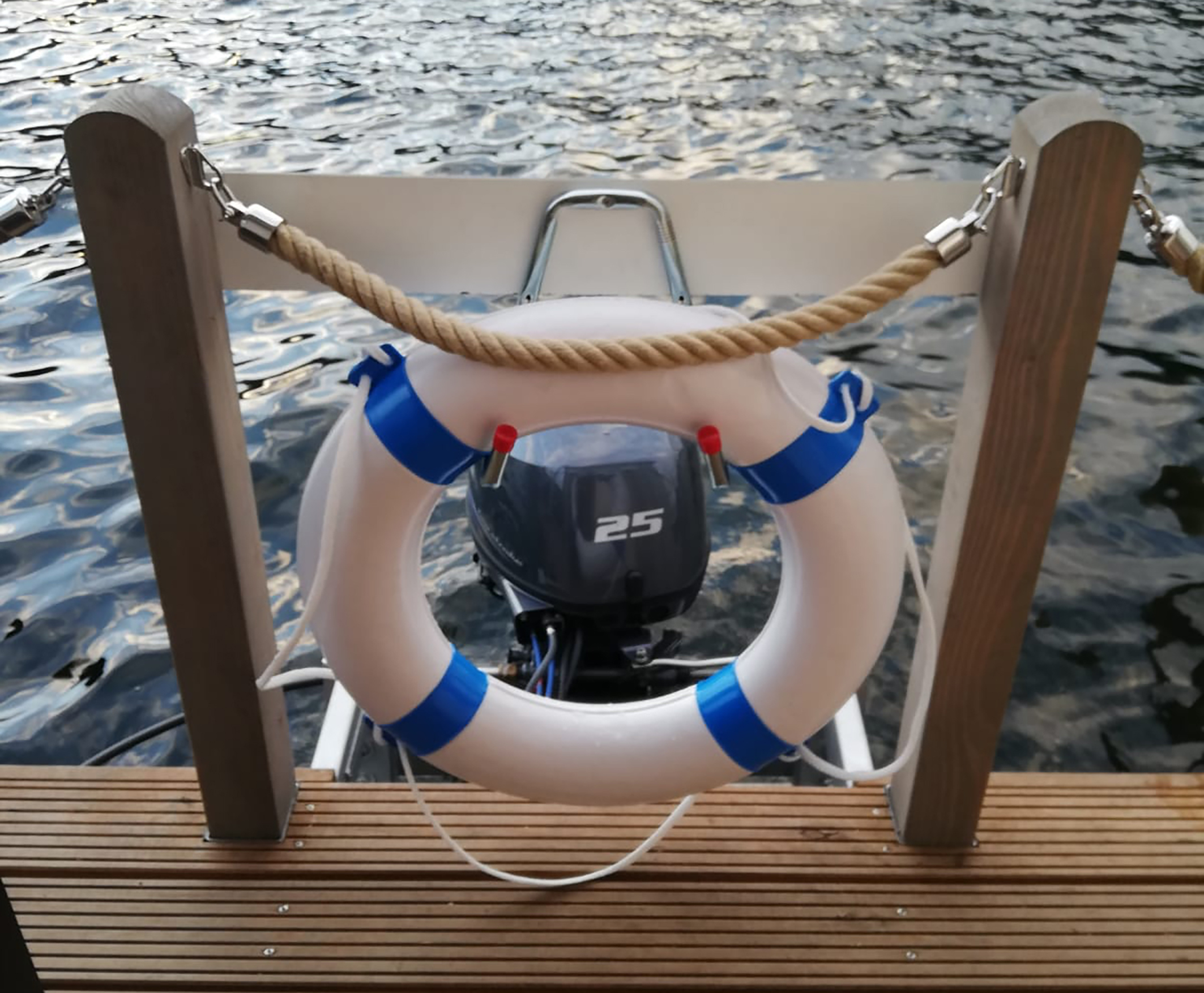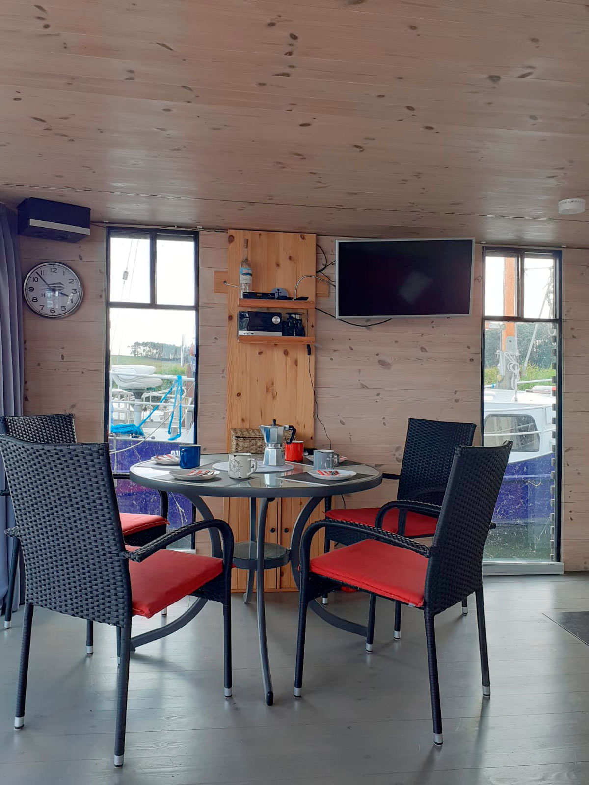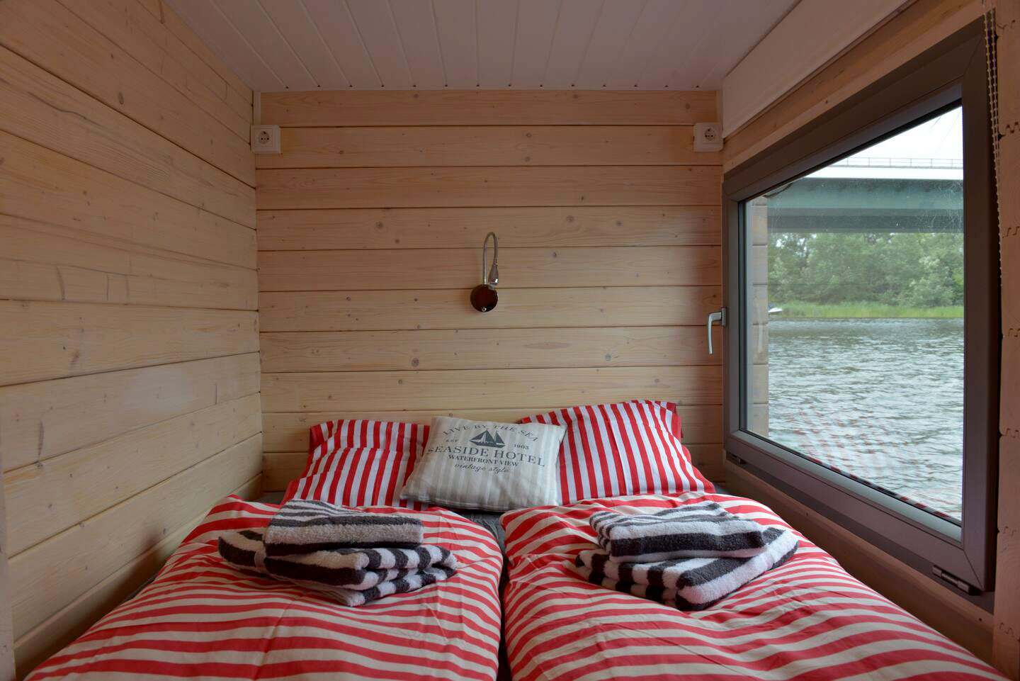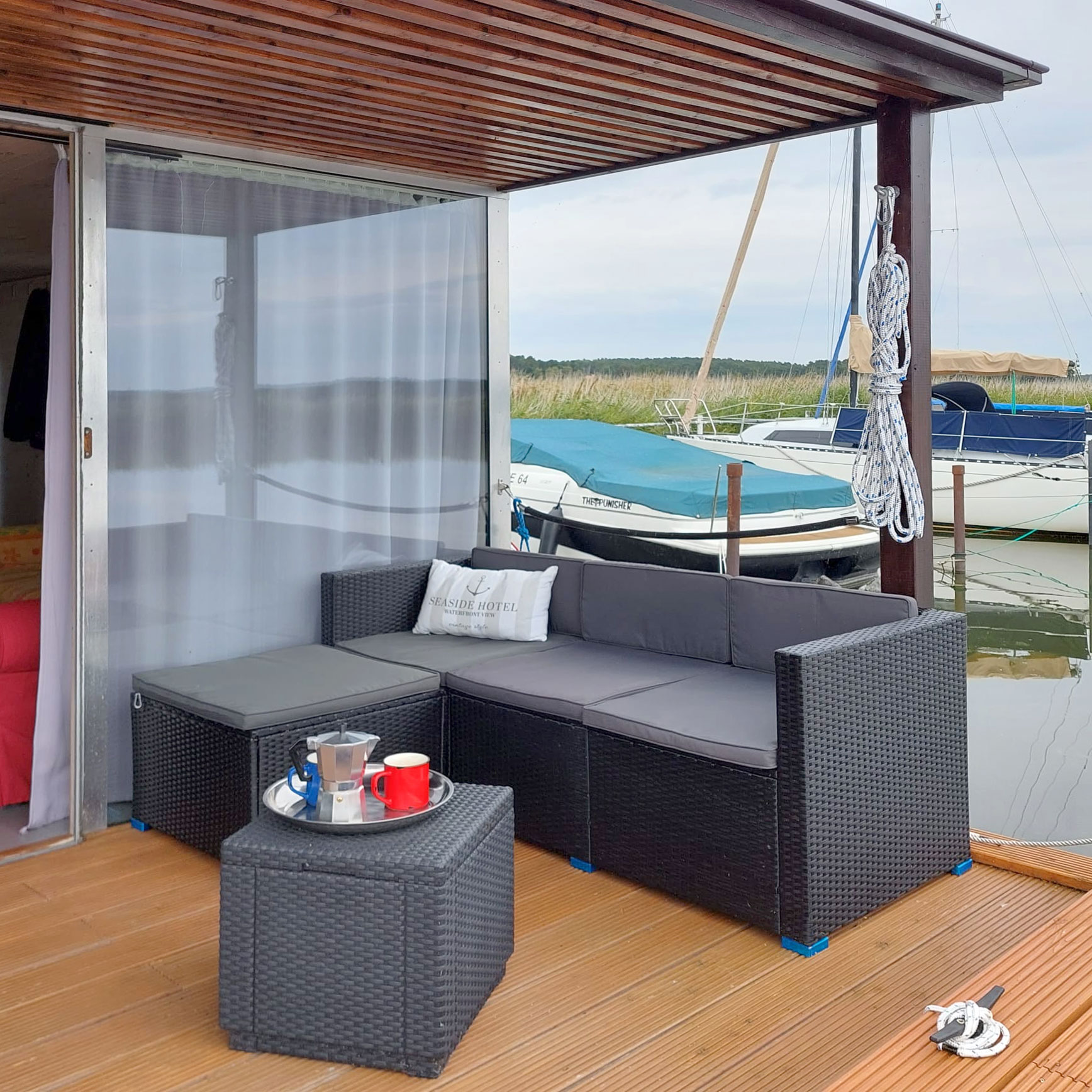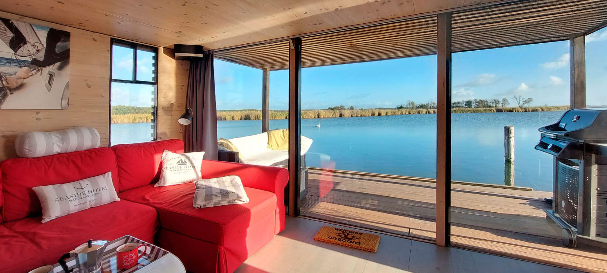 Das AquariHus ist ausgestattet mit zwei Kojen, WC und Dusche separat, sowie einem großzügigen Salon mit Pantryzeile als Kombüse. Eine knapp zehn qm große überdachte Terrasse – mit Lounge-Sofa und Gasgrill – lädt zum Verweilen ein. Ein Floß mit Badeleiter bietet eine zusätzliche Sonnenterrasse.
