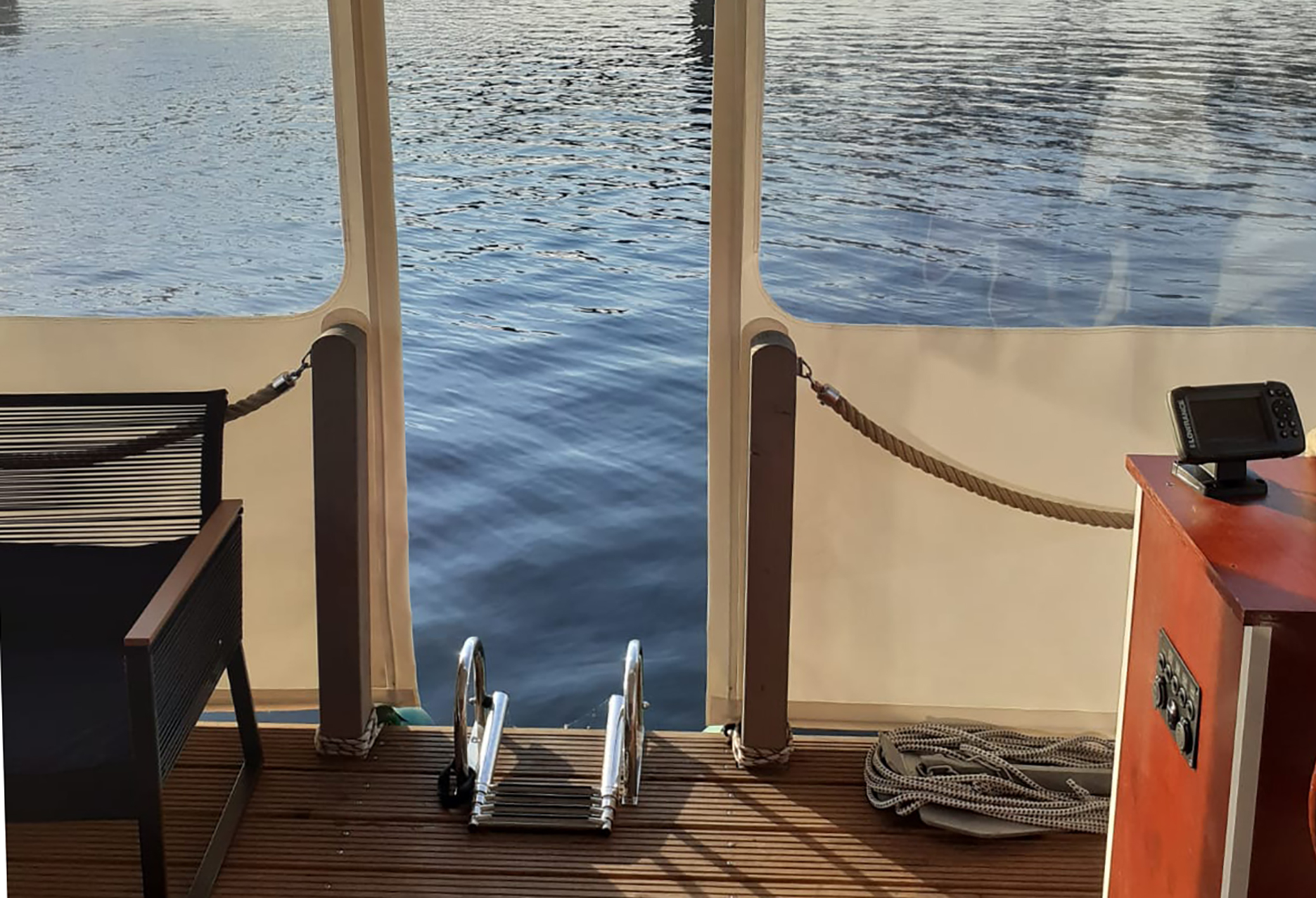 Von hier aus kann man mit einer Badeleiter direkt ins Wasser steigen. Je nach Wetterlage kann mit der Persenning – als optimaler Wind- und Wetterschutz – der Salon vergrößert werden. Auch am Heck befindet sich noch eine kleine Terrasse mit einer Bank.